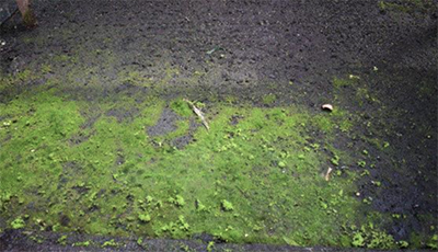• Sweep off growing surfaces and under benches after crops are moved or shipped. Built-up plant debris and growing media can dam up, causing water to puddle, which encourages algae proliferation. Remove the dam to reduce the algae growth.