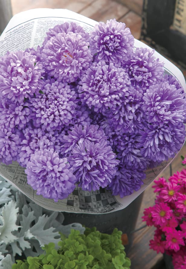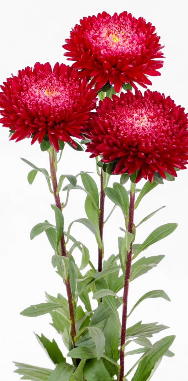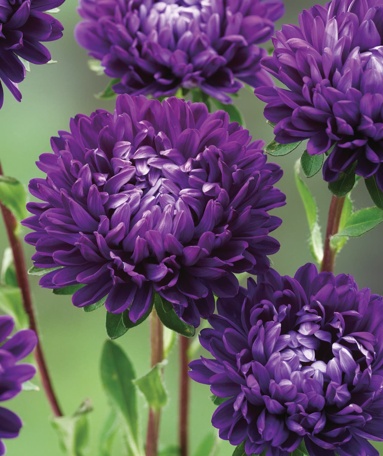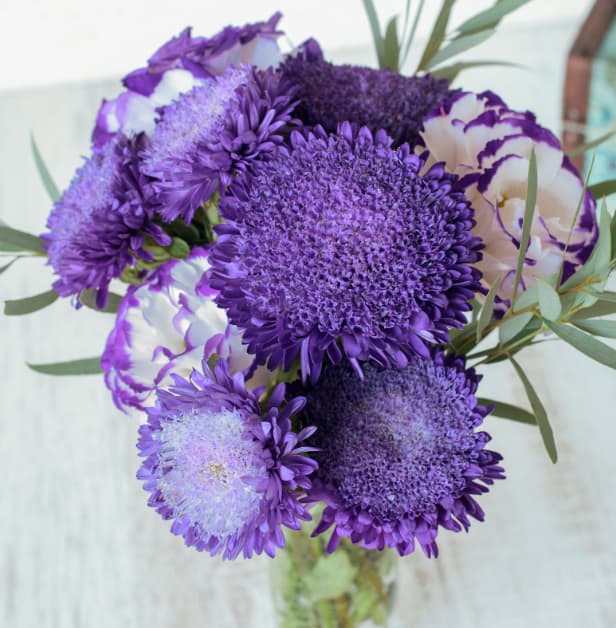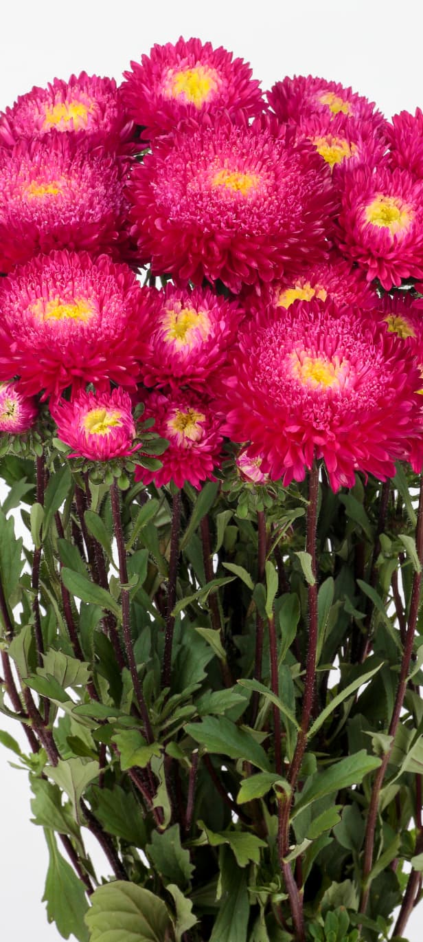 Today’s Asters vary from the traditional daisy forms to more modern pompom types (Azumi XL series) and chrysanthemum shapes (Optimo series). Asters can range in color from white to pale blues and purples. Their strong, straight stems branch into a spray of flowers perfect for floral arrangement. Asters can make a beautiful filler in a bouquet, especially with their classic yellow daisy center that complements a variety of bold blooms. It can also be a focal flower if grown as a disbud form with flowers up to 4 inches.