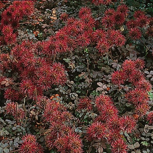 General Information: A vigourous, mat-forming, evergreen perennial. It’s pinnate, bronze-green leaves are divided into 9-15 rounded leaflets. Reddish-brown, spherical flowers in June and July are followed by bright red burrs which last until autumn.