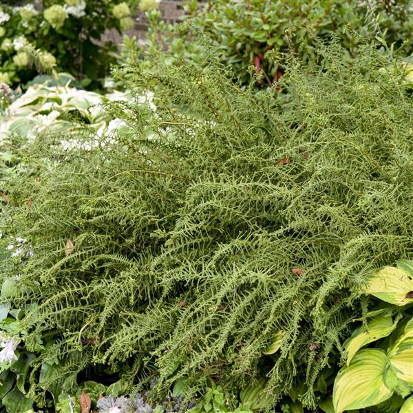 General Information: A dense mound of cascading dark green fronds. The end and sides of each pinna is crested in a crisscrossing pattern for additional garden texture.