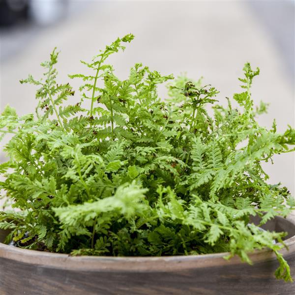 A vigorous crested fern. At maturity, individual leaves are flat with cresting along the edges and a large tassel at the end of each frond.