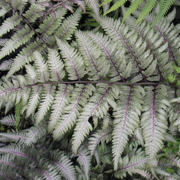 Also known as “Japanese Painted Fern.” Metallic, gray-green foliage linked by purple-red main mid rib. Frond size is 20 x 8 in. (50 x 20 cm). PPA Perennial Plant of the Year.