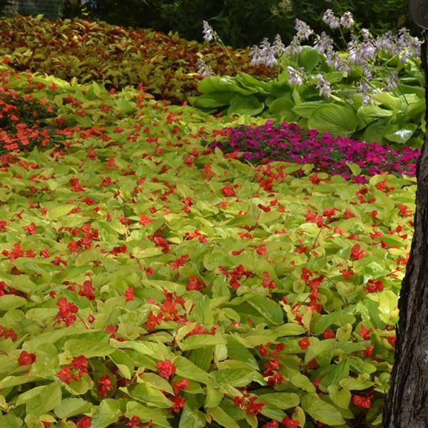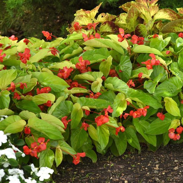 General Information: Canary Wings is a upright/mounded begonia with golden-to-chartreuse leaves and bright red flowers. The bright foliage and red flowers are outstanding in shaded conditions.