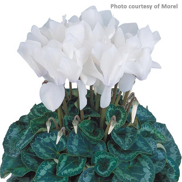 General Information: Large, fan-shaped blooms with a beautifully contrasting, white-ruffled edge over dark, marbled foliage. Flowers are well-centered on a voluminous plant. Variety is the largest cyclamen with the largest flowers. Performs well across a range of conditions, including high heat/light. Vigorous and best in larger pots.
