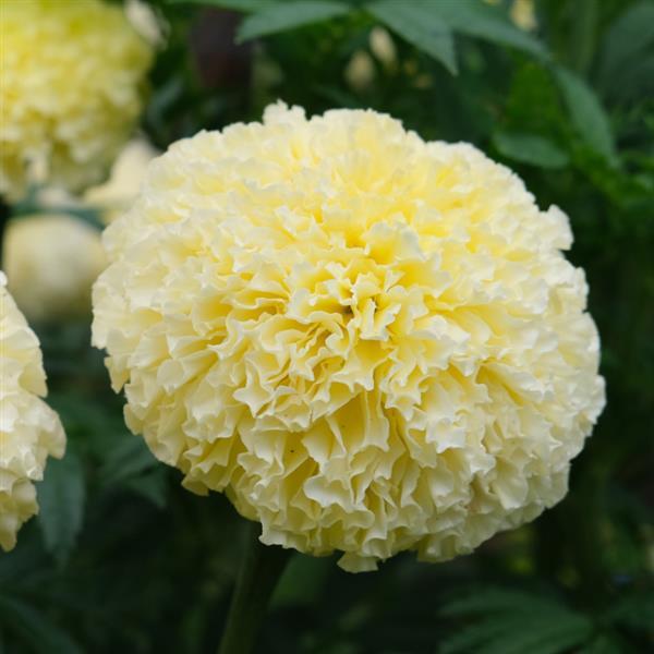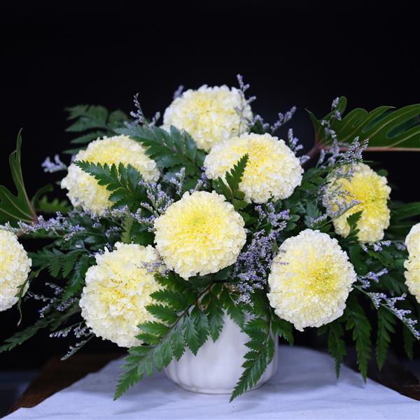 General Information: Cream-colored, fully double, uniform blooms on a more compact, sturdy, uniform plant. Produces a mild, sweet, marshmallow fragrance, without the typical, stong marigold scent. Significantly taller and higher quality than all other white marigolds.