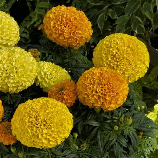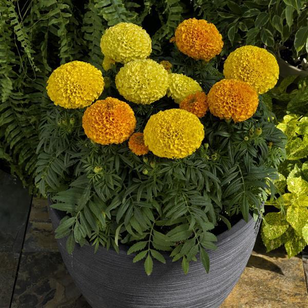 Dwarf, compact plants need little to no PGRs and deliver excellent landscape performance. Thick flower stems keep the bright and large, fully double flowers standing upright. Uniform bloom time and height across the gold, orange and yellow varieties.