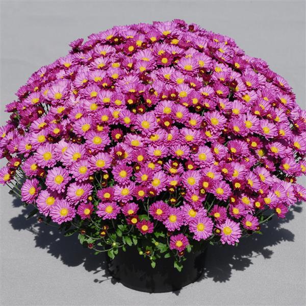 One of the nicest daisies available in garden mums! Dark pink flowers (almost purple in cool finishes) virtually engulf the plant, making it a great impulse item at retail. Easy to grow in any size pot. Amphion Purple features dark foliage, flexible stems and a spherical European habit.