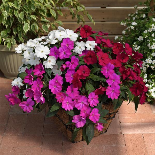 SunPatiens offers mixes containing three colors that have been trialed and proven to grow well together. The components are packaged and shipped together, so you can stick them in the same container to create these sensational color combos. Contains Compact Classic White, Compact Royal Magenta and NEW Compact Lilac Improved impatiens.