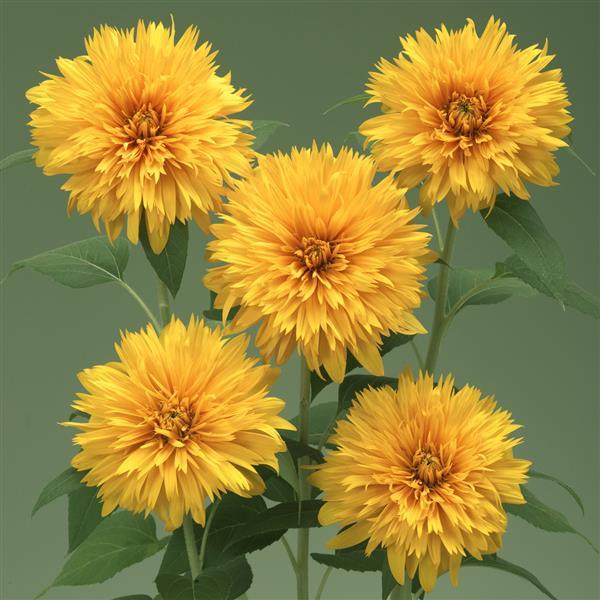 Fully double, golden-yellow blooms with light faces on branched stems. Plants can reach 6 feet (180 cm). Avoid Winter production. 70 days.