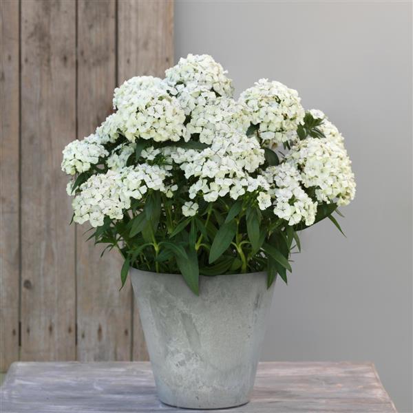 Earlier to flower with a better plant habit and more colour showing at retail than the competing white.
