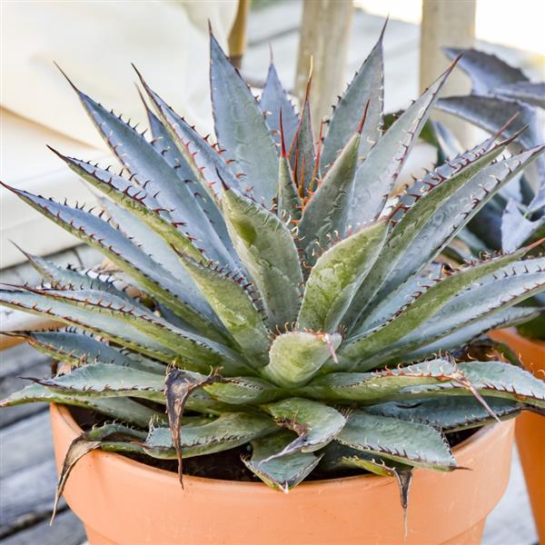 Smaller scale mangave has “teeth”--long and pronounced spines in a rainbow of colors, ranging from cinnamon brown to yellow to orange. Blue green leaves have faint spotting.